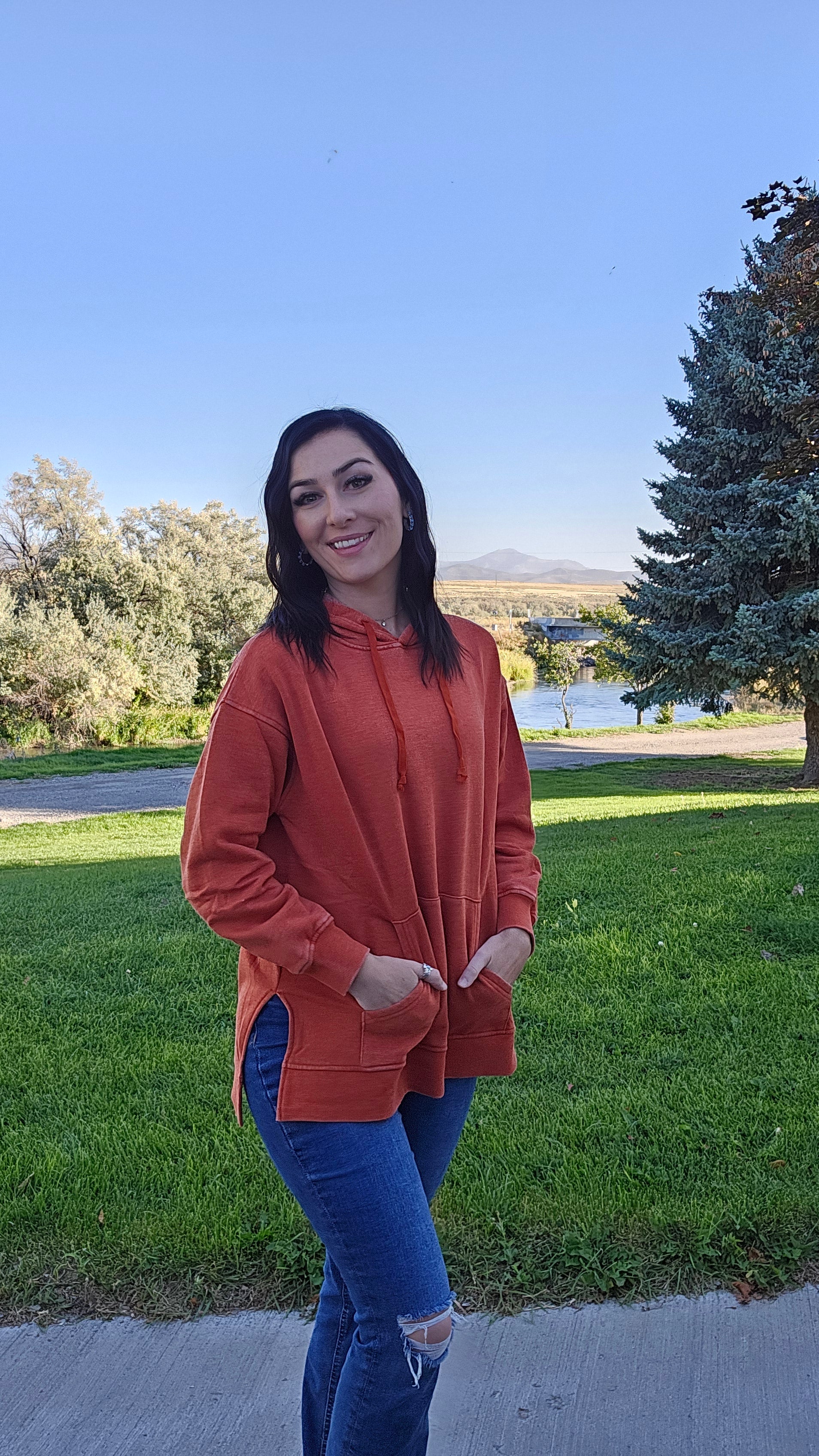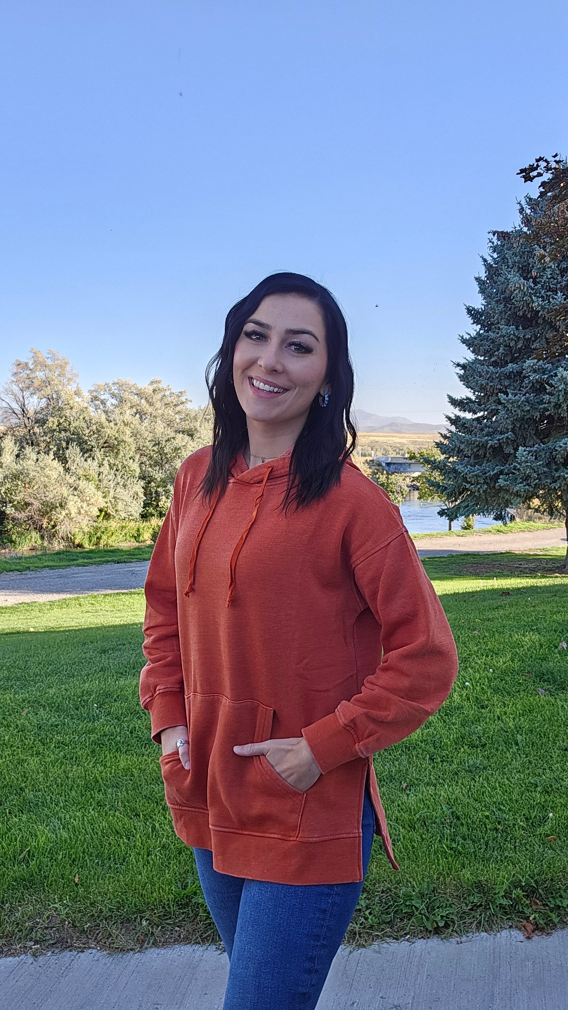 Introducing our newest vintage wash hoodie with a kangaroo pocket and stylish slid slits. Made with a unique vintage wash fabric, it's a cozy and trendy addition to your wardrobe. Plus, it runs true to size for the perfect fit.